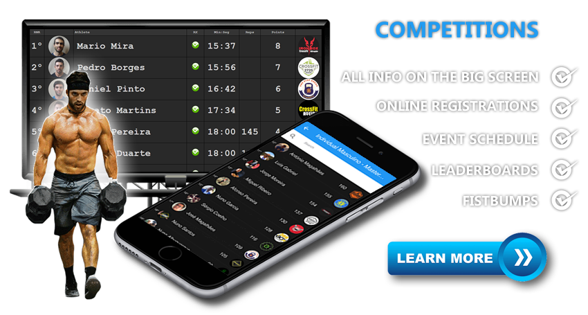 Create the workout plan with preconfigured exercises and WODS. Associate movements and videos. Score logging (individual, pairs, teams, time, reps, rounds + reps, etc.).